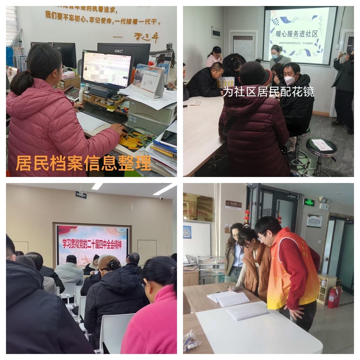 興業(yè)社區(qū)公益崗人員正在進(jìn)行居民檔案信息整理,西澇臺(tái)社區(qū)協(xié)助社區(qū)居民配花鏡,青州街社區(qū)組織黨員學(xué)習(xí),東澇臺(tái)社區(qū)協(xié)助網(wǎng)格員進(jìn)行入戶登記居民信息。通過此次檢查,以上社區(qū)公益崗人員簽到規(guī)范、無遲到早退,積極配合社區(qū)工作人員,充分發(fā)揮公益崗人員在基層管理和公共服務(wù)中的重要作用。